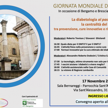 Nell’ambito della “Giornata Mondiale del Diabete 2023”, e in occasione di “Bergamo e Brescia Capitale della Cultura”, domani, venerdì 17 novembre, nella Sala Bernareggi della Parrocchia Sant’Alessandro in Colonna di via Sant’Alessandro 31 a Bergamo (ingresso libero), si terrà un convegno dal titolo “La diabetologia al passo con i tempi: la centralità del paziente tra…